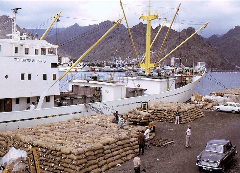 En la foto del archivo de Miguel Bravo vemos una vista parcial del buque “Mediterranean Sprinter” atracado en el muelle sur del puerto de Santa Cruz de Tenerife, descargando sacos de papas traídos de Inglaterra.