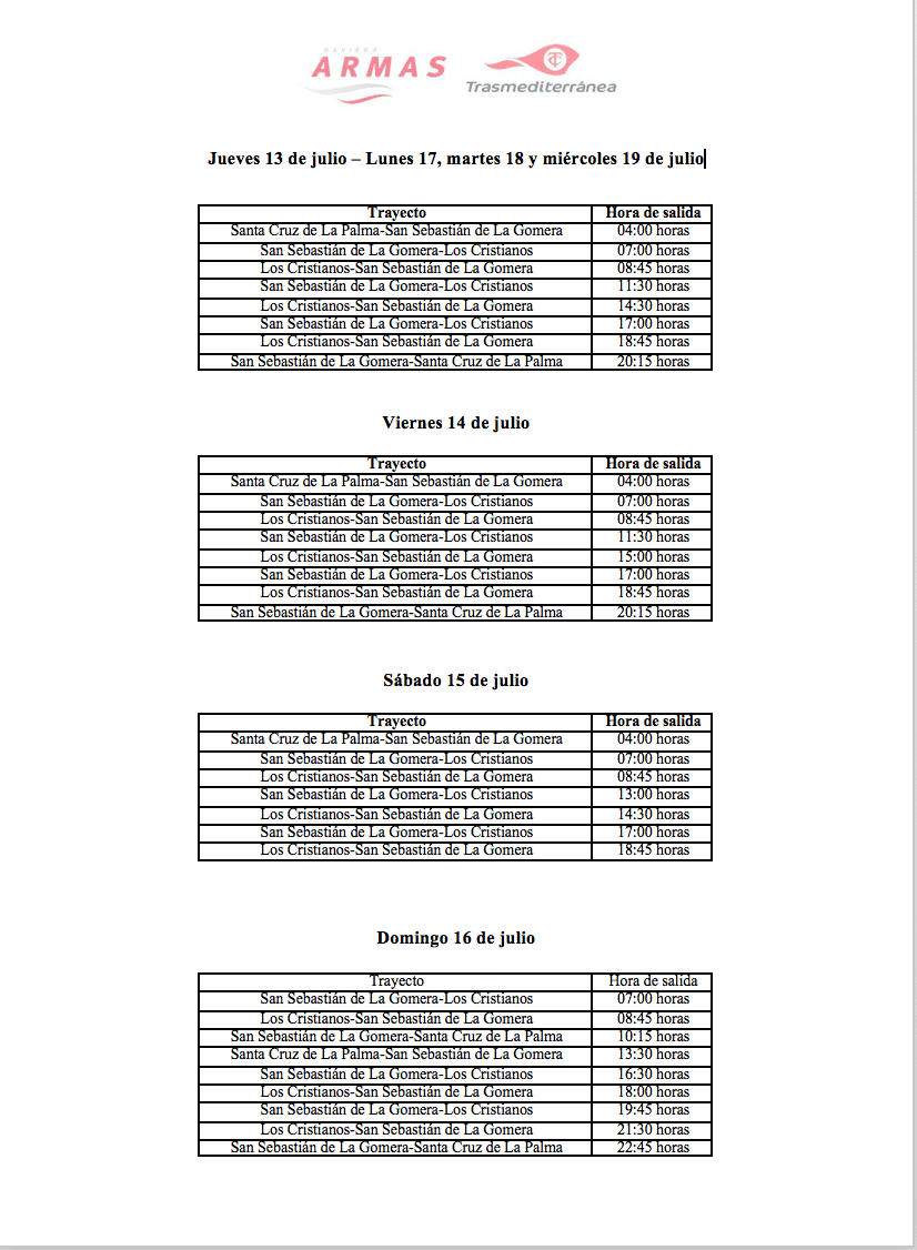 Por necesidades de programación, Naviera Armas Trasmediterránea informa de que reorganiza las rotaciones del ferry “Volcán de Taburiente” en la línea Santa Cruz de La Palma-San Sebastián de La Gomera-Los Cristianos y viceversa, del jueves 13 al miércoles 19 de julio de 2023, de acuerdo los horarios en la tabla adjunta.