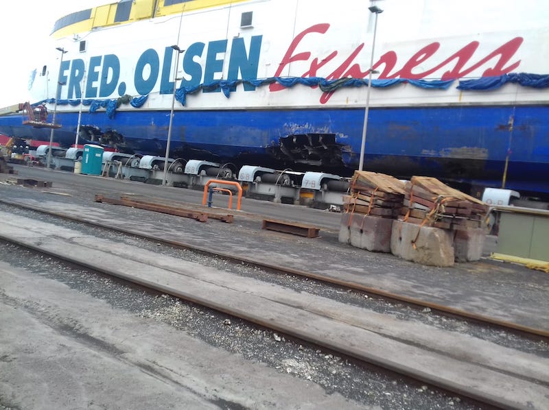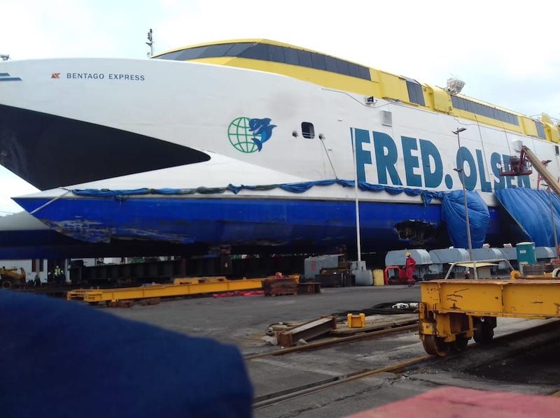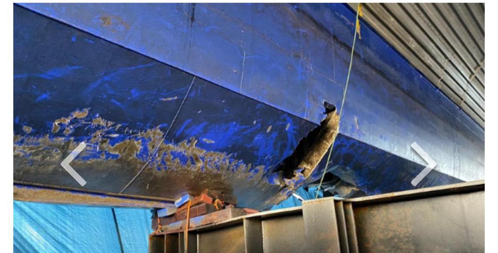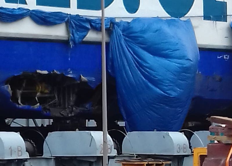 Las primeras inspecciones del casco de babor del catamarán “Bentago Express” muestran daños de diversa cuantía. A primera vista se aprecian dos cortes importantes en la parte exterior correspondientes a la zona donde estuvo embarrancado desde la noche del 7 de enero hasta su reflotamiento cinco días después.