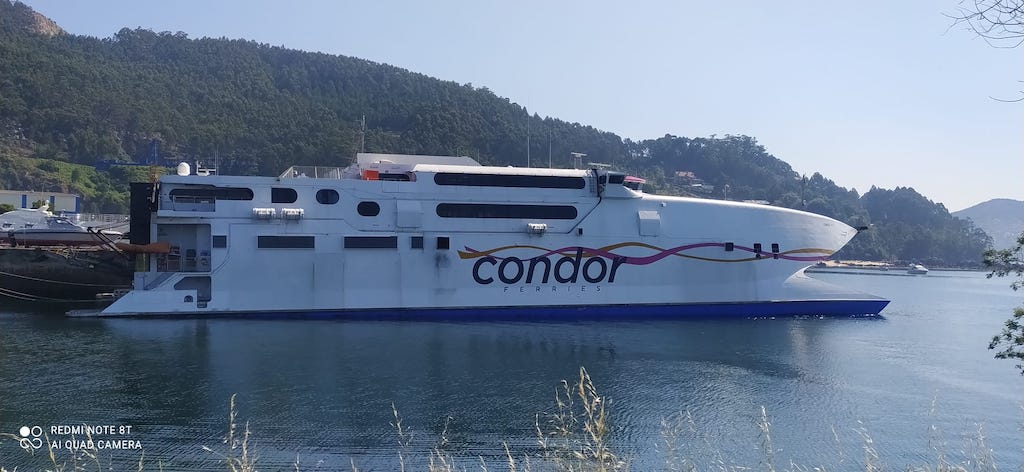 La más reciente adquisición de la naviera ibicenca Trasmapi, el catamarán “Condor Rapide”, se encuentra amarrado en uno de los muelles de Rodman (antigua ASCON) en Meira, cerca de Moaña. Este astillero será el encargado de darle un lavado de cara a este buque, antes de su próxima incorporación, aunque se aprecia que su estado de conservación externo es aceptable.