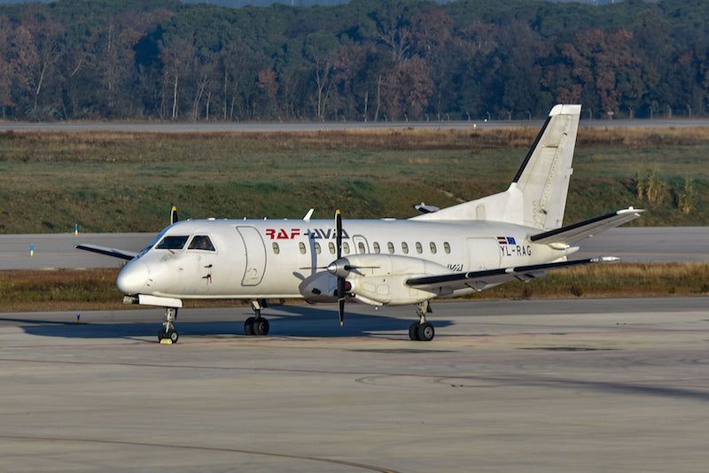En 1999 cesó el programa con un saldo de 459 unidades fabricadas y siete variantes, entre ellas el Saab 340A (F), que vemos en la imagen de Joan Carles LaCruz. Se trata, en origen, de un avión con capacidad para 36 pasajeros propulsado por dos motores turbohélices GE CT7-5A2, número de serie 52, que inició su vida aeronáutica en abril de 1986 con la compañía Kendell Airines (VH-KDP). En agosto de 2002 pasó a Rex Regional Airlines y en agosto de 2005 a la aerolínea lituana Raf-Avia (YL-RAG), siendo trasformado en carguero.