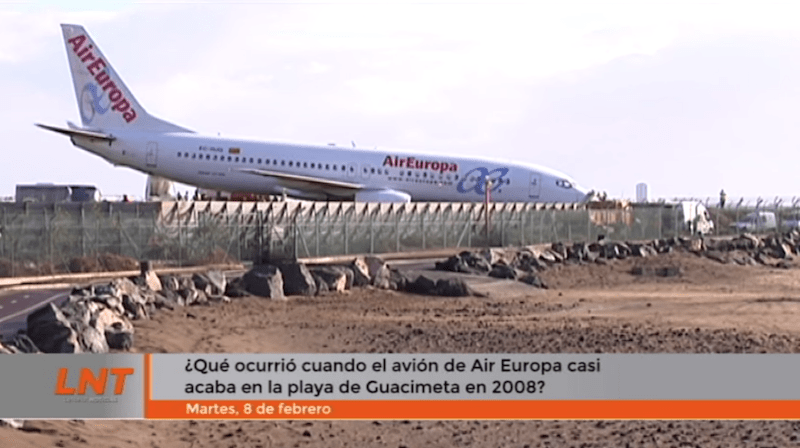 Lancelot Digital se hace eco de la investigación realizada por la Comisión de Investigación de Accidentes e Incidentes de Aviación Civil Española referida a los motivos del accidente de un avión Boeing B-737 de Air Europa ocurrido en 2008 en el aeropuerto de la Isla de los Volcanes, cuando llegaba procedente de Glasgow, en el que se salió de la pista y quedó a escasos metros de la playa de Guacimeta.