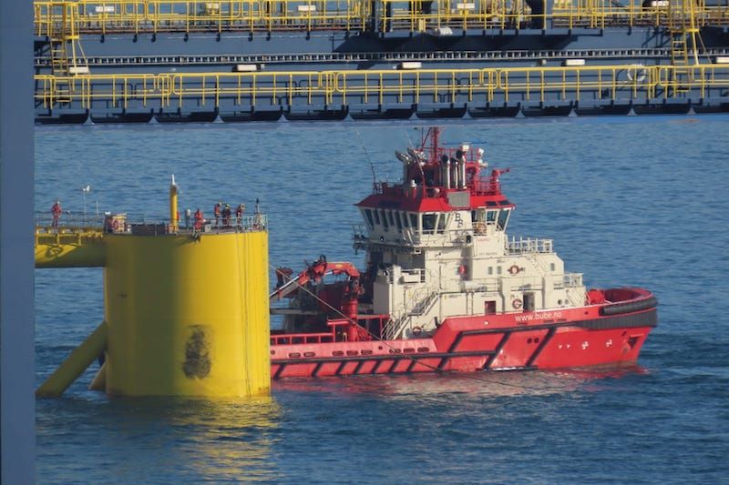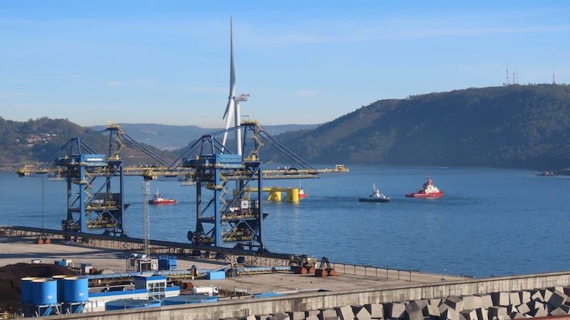 A las 13 h de hoy comenzó la maniobra de remolque del segundo “windfloat” del proyecto Windfloat Atlantic situado en la costa de Viana do Castelo, Portugal, desde el puerto exterior de Ferrol, primero con la ayuda de los remolcadores con base de operaciones en el puerto ferrolano y dos horas después se hizo cargo el remolcador “BB Power”, que fue alargando el remolque, de modo que a una milla aproximada del dique de abrigo llevaba ya unos 300 m.