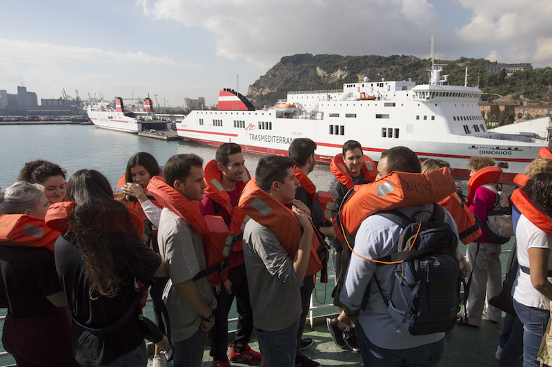 Medio millar de voluntarios de la Escuela de Náutica de Barcelona, entre alumnos, amigos y familiares, han participado esta mañana en un simulacro de evacuación en el buque “Juan J. Sister”, de Trasmediterránea, atracado en el puerto de Barcelona, bajo la supervisión del capitán marítimo, Javier Valencia.