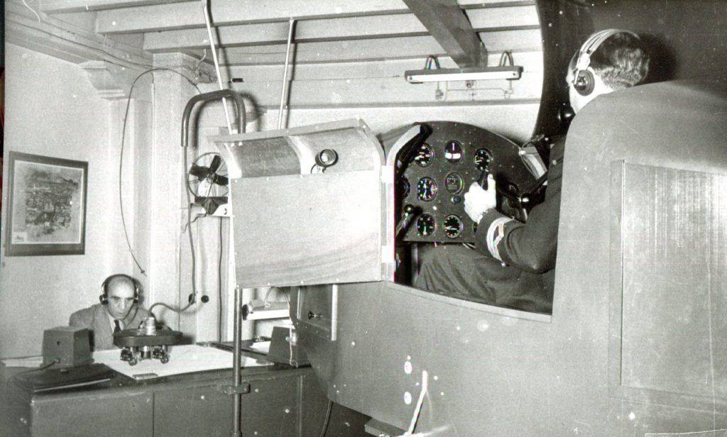 Telesforo Espinel citaba a sus alumnos en la cafetería Hontanares, situada en la avenida de América, en los bajos de un edificio en el que Iberia tuvo oficinas. En la foto le vemos siguiendo la ruta del primer simulador de vuelo que tuvo Iberia en la década de los años cuarenta. El aparato se conserva en el Museo de la FIO. Una amplia colección de fotografías llegaron al archivo de la compañía en la época en la que quien suscribe le correspondió llevar adelante el proyecto del libro “Iberia. Mil fotos para la Historia” y avanzamos en la idea, nunca materializada, del Museo de Iberia.