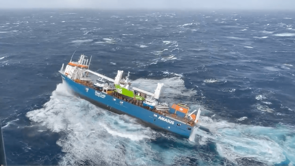 El buque se encuentra a unas 40 millas de la costa oeste de Noruega. Con los tremendos bandazos a que está sometido, parte de la carga que tenía sobre cubierta ha caído al agua.