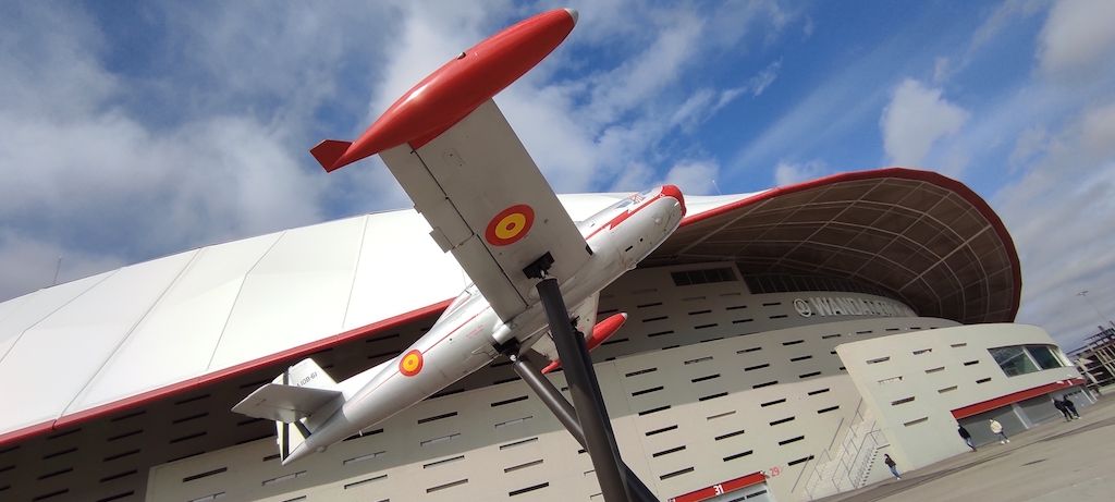 Lo cierto es que la presencia de este avión rinde homenaje a la época en la que el club de fútbol se denominó Atlético-Aviación. Y es que en 1939, recién acabada la guerra civil, con el país destrozado, para mantener el espíritu deportivo y la continuidad del equipo se propuso la fusión con el club Aviación Nacional, cuyos jugadores eran militares y deportivamente estaban bien formados.