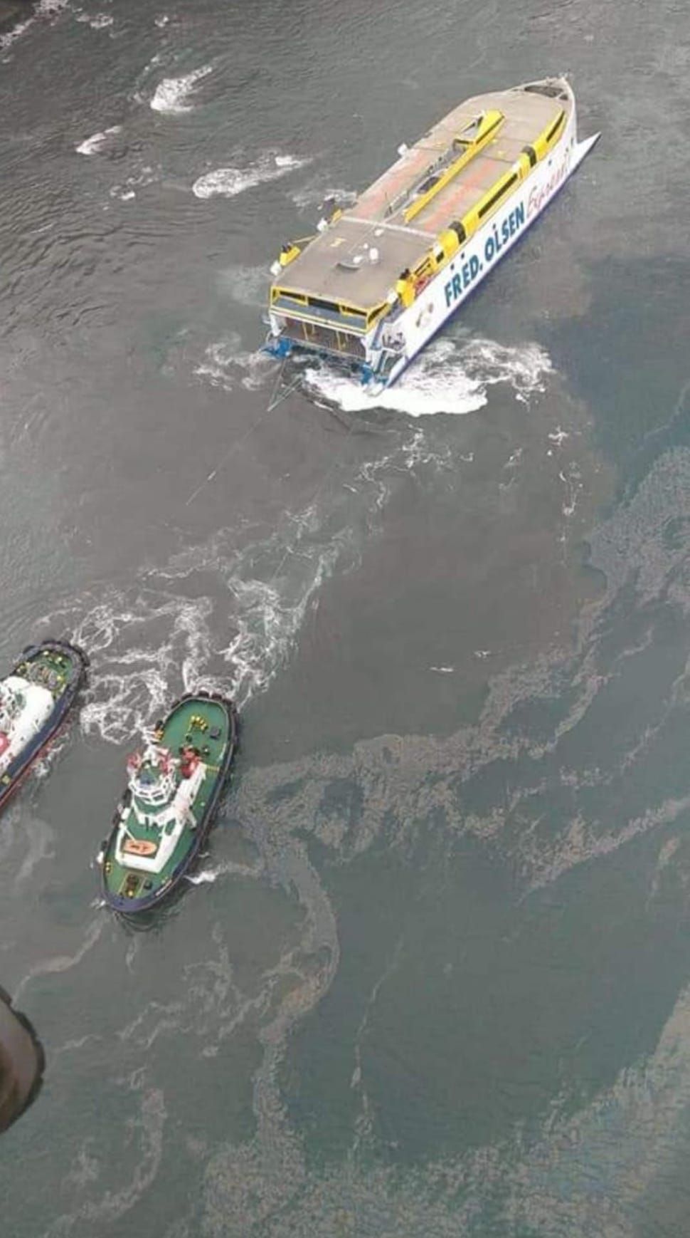 El jefe de Flota de Fred. Olsen, Juan Ignacio Liaño, afirma que “la mancha está controlada. No se trata de una fuga, sino de unas leves irisaciones provenientes del combustible y al ser gasóleo, no fuel pesado, se evapora del agua y no queda contaminación en ella”.