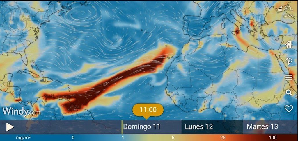 Tenerife_Meteo alerta en su cuenta de twitter la posibilidad de que una nube de dióxido de azufre procedente del volcán Le Soufrière, que se encuentra en erupción en la isla de St. Vincent & Grenadines, en el Caribe, pueda alcanzar Canarias en las próximas horas, debido a su veloz desplazamiento por el Atlántico. La edición digital de Diario de Avisos, decano de la prensa de Canarias, también se hace eco de la noticia.
