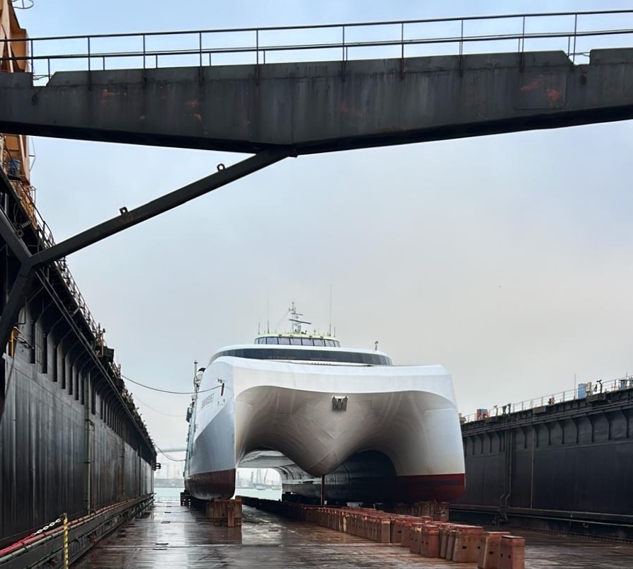 Las imágenes permiten apreciar la finura de las formas del casco del primero de una serie de cinco catamaranes de proyecto australiano y construidos en Astilleros Armón Gijón, de los que dos están navegando, uno tercero de la misma serie está en construcción y en las próximas semanas comenzarán las obras de otros dos eléctricos más pequeños para la línea Tarifa-Tánger Ville.