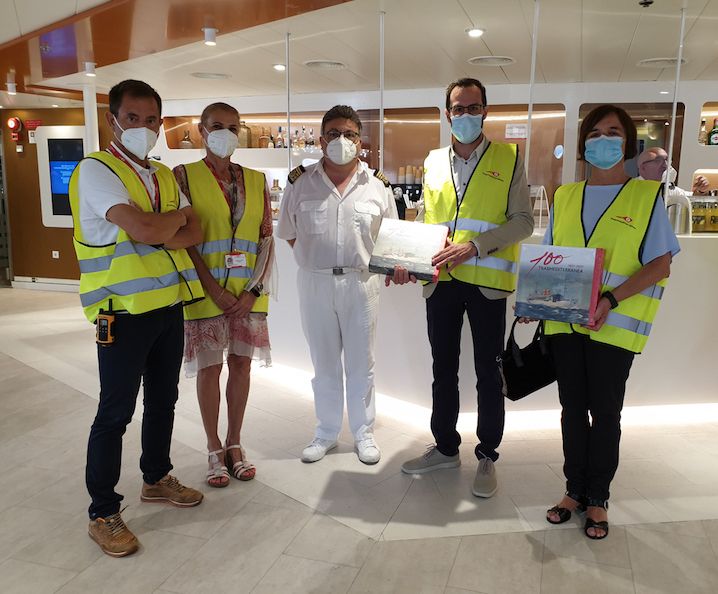 El alcalde de Mahón, Héctor Pons, hizo entrega al capitán del buque, José Ignacio Marco Preto, de un cuadro con el escudo de la Ciudad. A su vez, el capitán obsequió a cada uno de los visitantes con un ejemplar del libro del Centenario de la naviera. Tanto el alcalde de la capital menorquina como la regidora de Microciudad, Economía, Comercio y Turismo pudieron disfrutar de una visita guiada por todas las zonas comunes, camarotes y servicios del buque