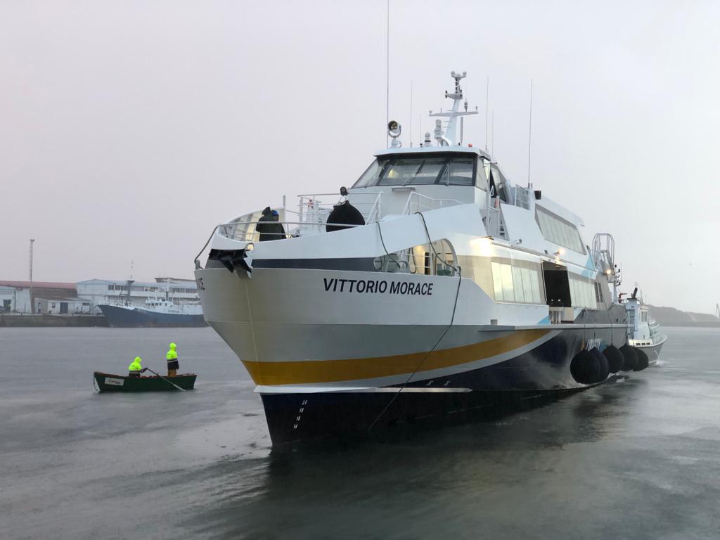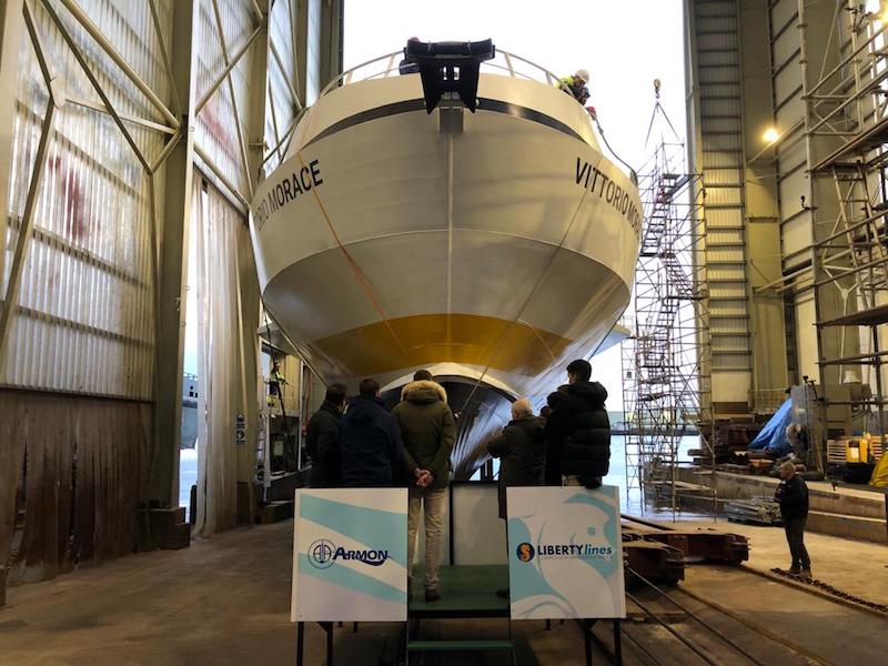 Después de la bendición por el párroco de la ciudad, la madrina Katia Riggio, en presencia de José Ramón Fernández y Laudelino Alperi, presidente y consejero delegado del Grupo Armón, estrelló una botella de champaña contra la proa del nuevo buque, que ostenta el nombre de “Vittorio Morace”, fundador y primer presidente de la compañía, fallecido en 2022 y se deslizó suavemente por la grada entre los aplausos y la emoción de los asistentes.
