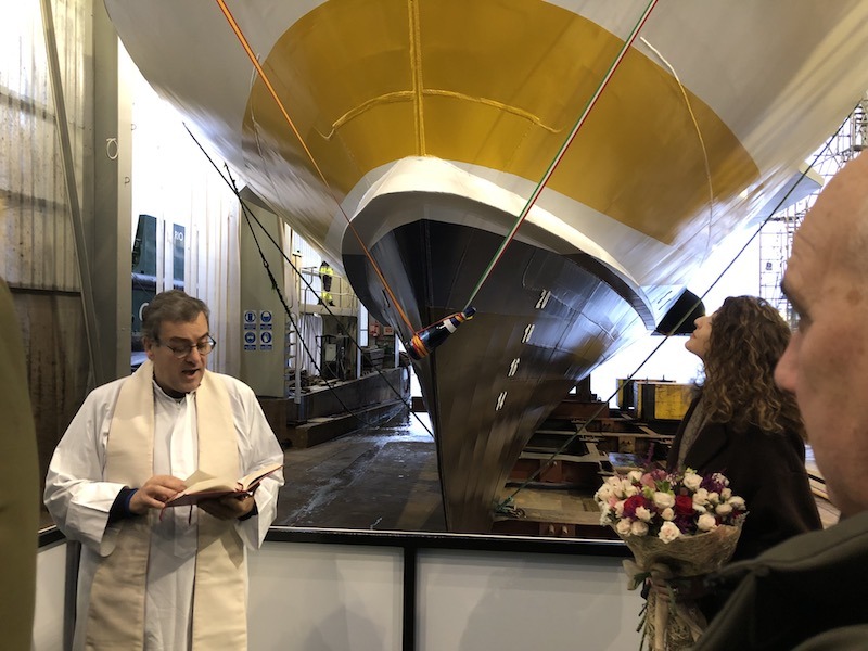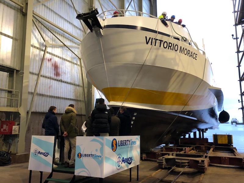 Después de la bendición por el párroco de la ciudad, la madrina Katia Riggio, en presencia de José Ramón Fernández y Laudelino Alperi, presidente y consejero delegado del Grupo Armón, estrelló una botella de champaña contra la proa del nuevo buque, que ostenta el nombre de “Vittorio Morace”, fundador y primer presidente de la compañía, fallecido en 2022 y se deslizó suavemente por la grada entre los aplausos y la emoción de los asistentes.
