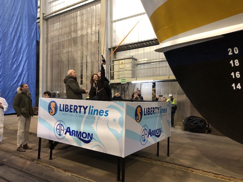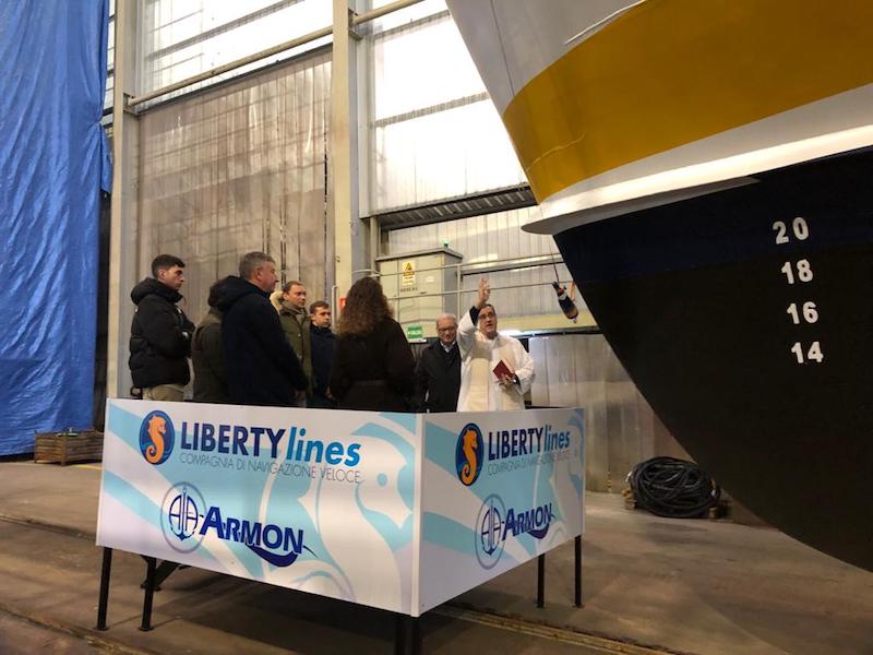 El primero de los nueve buques monocascos híbridos de alta velocidad contratados por la compañía italiana Liberty Lines con el grupo Astilleros Armón, se encuentra a flote desde primera hora de la mañana del pasado lunes 4 de diciembre, en que se procedió a su botadura en el astillero de Burela (Lugo), informa la naviera con sede en Trapani.